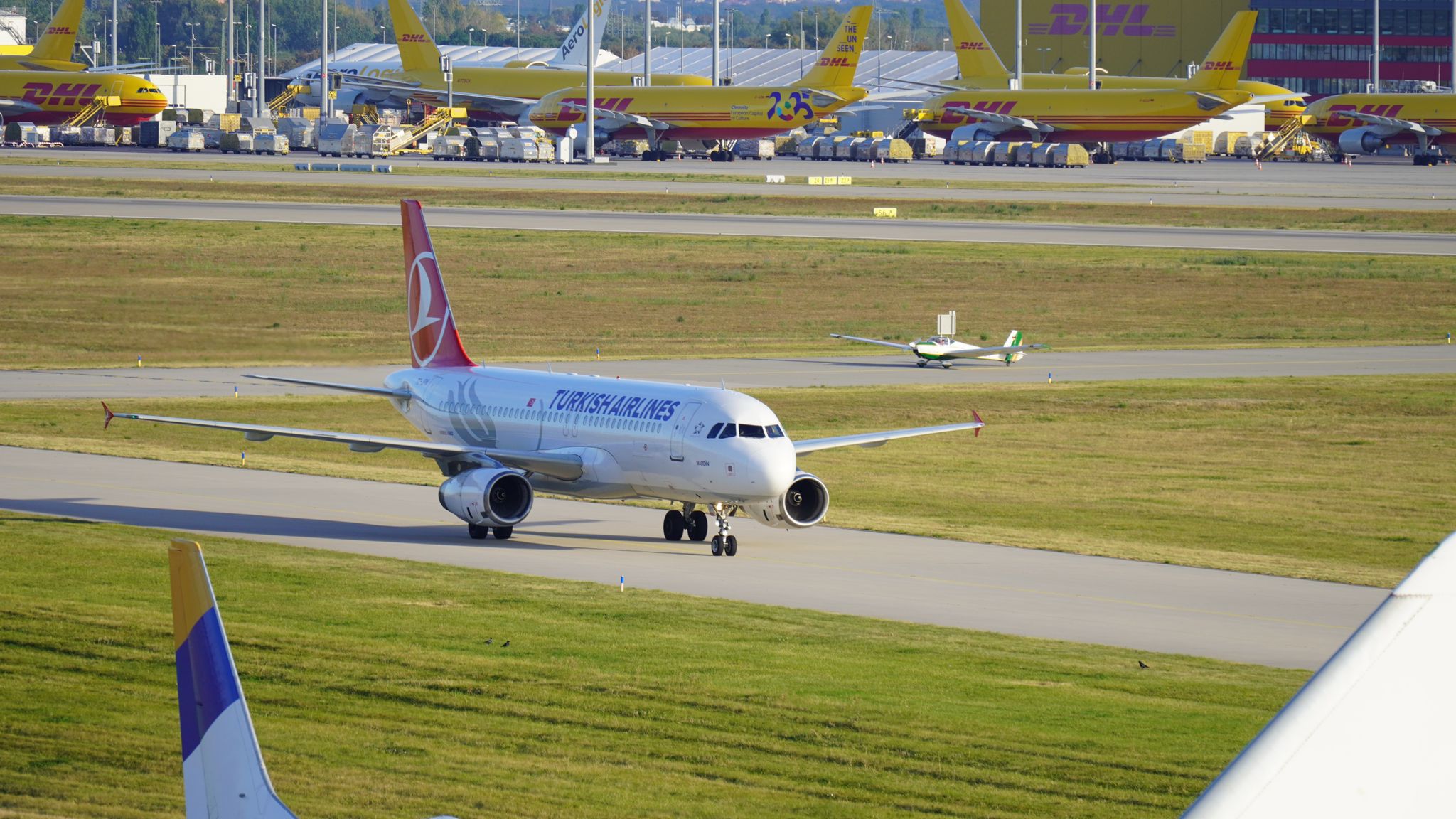 Nach der Landung mussten wir kurz warten – auf dem Taxiway rollte gerade eine Turkish Airlines A320 vorbei, dahinter eine Condor A321. Plötzlich ist man mittendrin, im echten Verkehrsfluss eines internationalen Airports – und mittendrin dieser kleine Motorsegler.