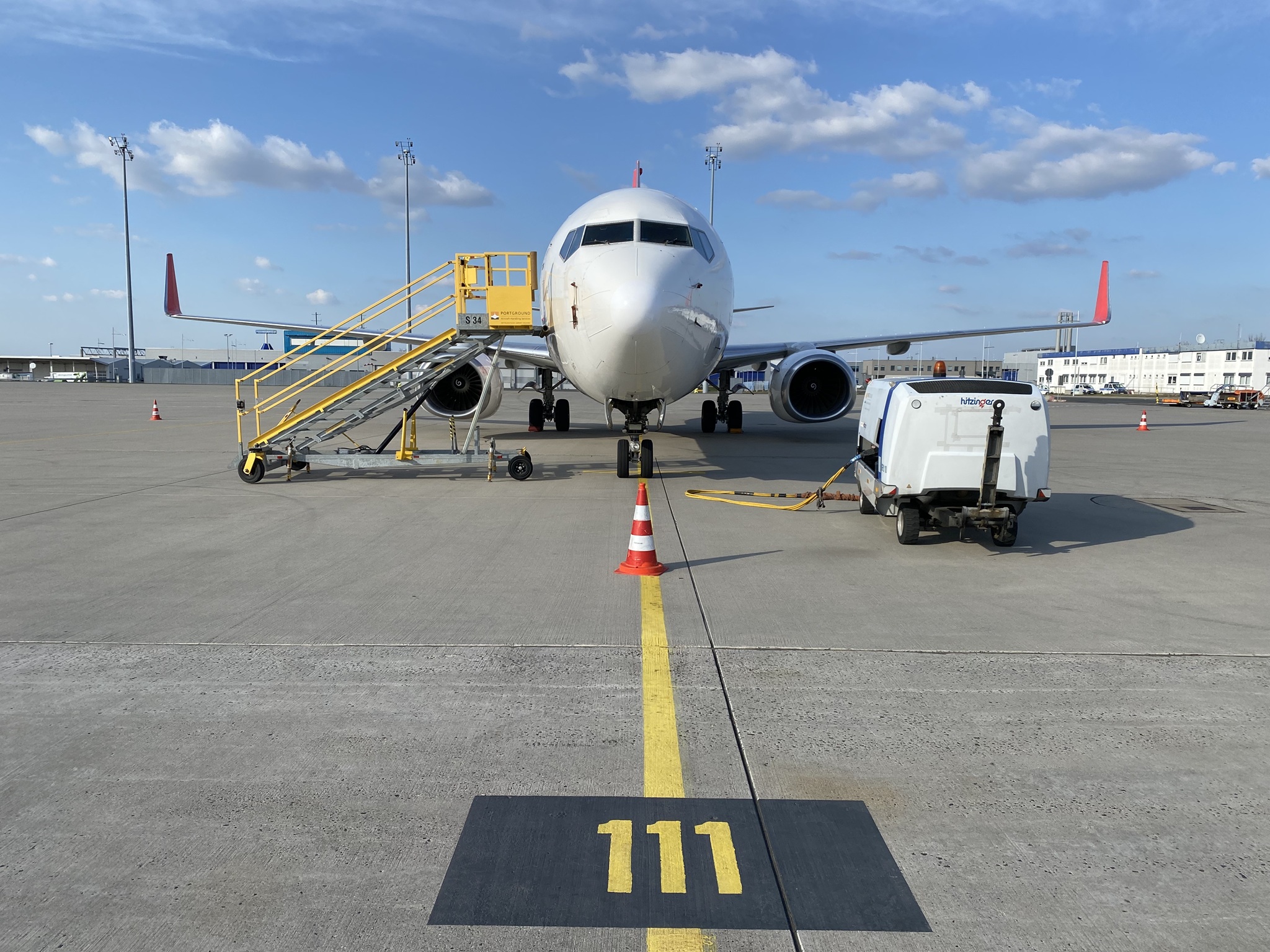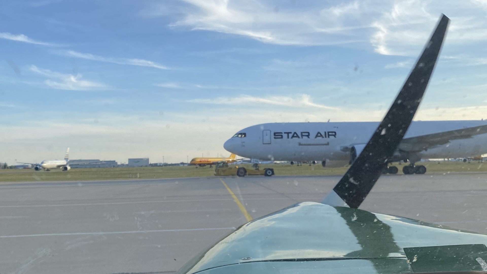 Das Follow-Me wartete schon am Boden, um uns zur Parkposition auf dem Vorfeld zu bringen. Mit einer C42 eingewiesen zu werden, während im Hintergrund eine 737 von Compass Air Cargo geparkt ist, bringt mich immer wieder zum Schmunzeln. Der Verkehr war zu dem Zeitpunkt recht überschaubar: eine 777 startete, eine landete und eine 737 flog ab.