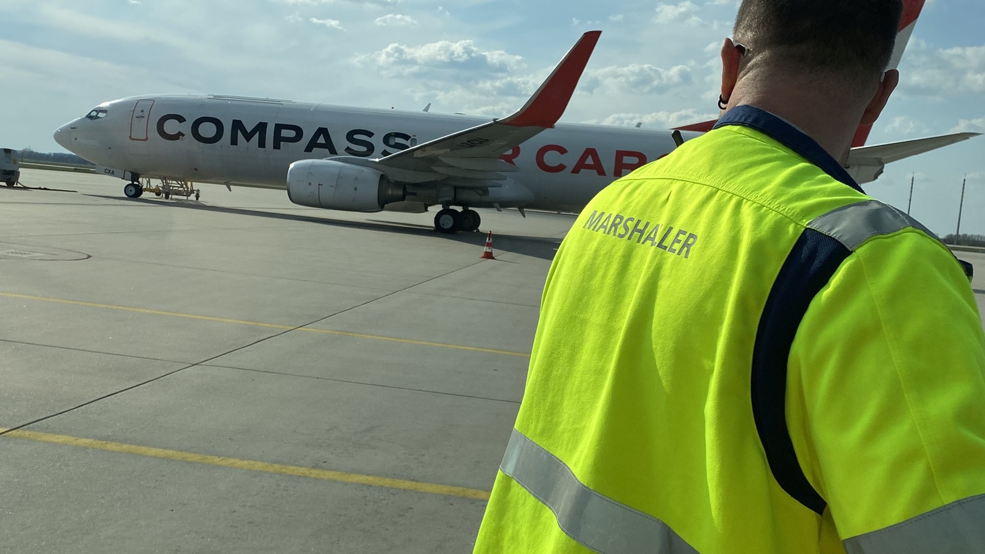 Was dann kam, war fast noch surrealer: Ein Follow-Me-Fahrzeug holte uns ab und lotste uns zur Parkposition. Dort wurden wir mit Einweisung per Kellen eingewiesen – wie ein echter VIP. Der Blick zurück über die Schulter, rüber zur riesigen Runway, war einfach nur: Wow.